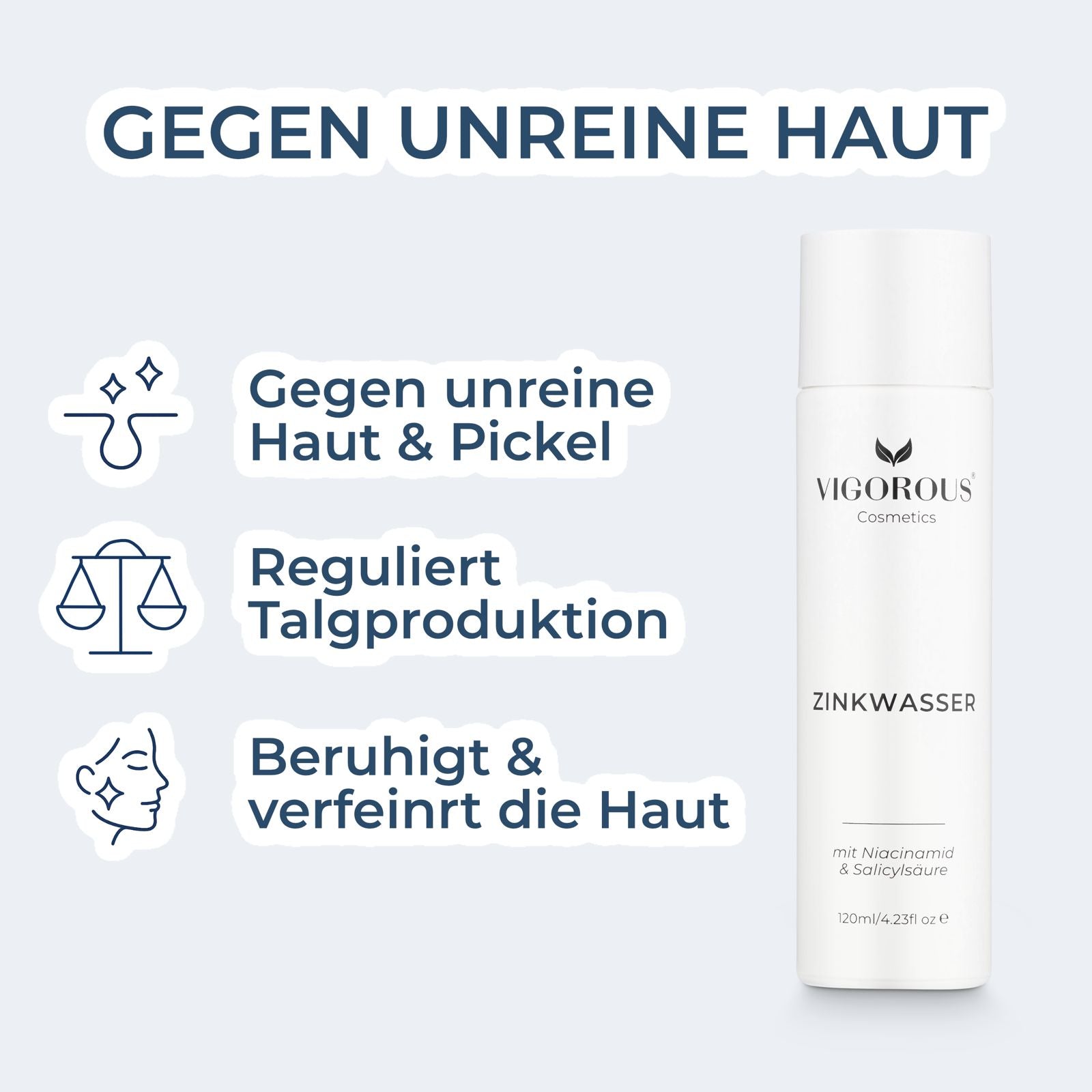 Wenn’s drauf ankommt, soll deine Haut mitspielen. Unser Zinkwasser hilft dir genau dann, wenn ein Pickel einfach nicht reinpasst. Es reduziert Rötungen, trocknet Pickel aus und lässt sie schnell sichtbar abklingen